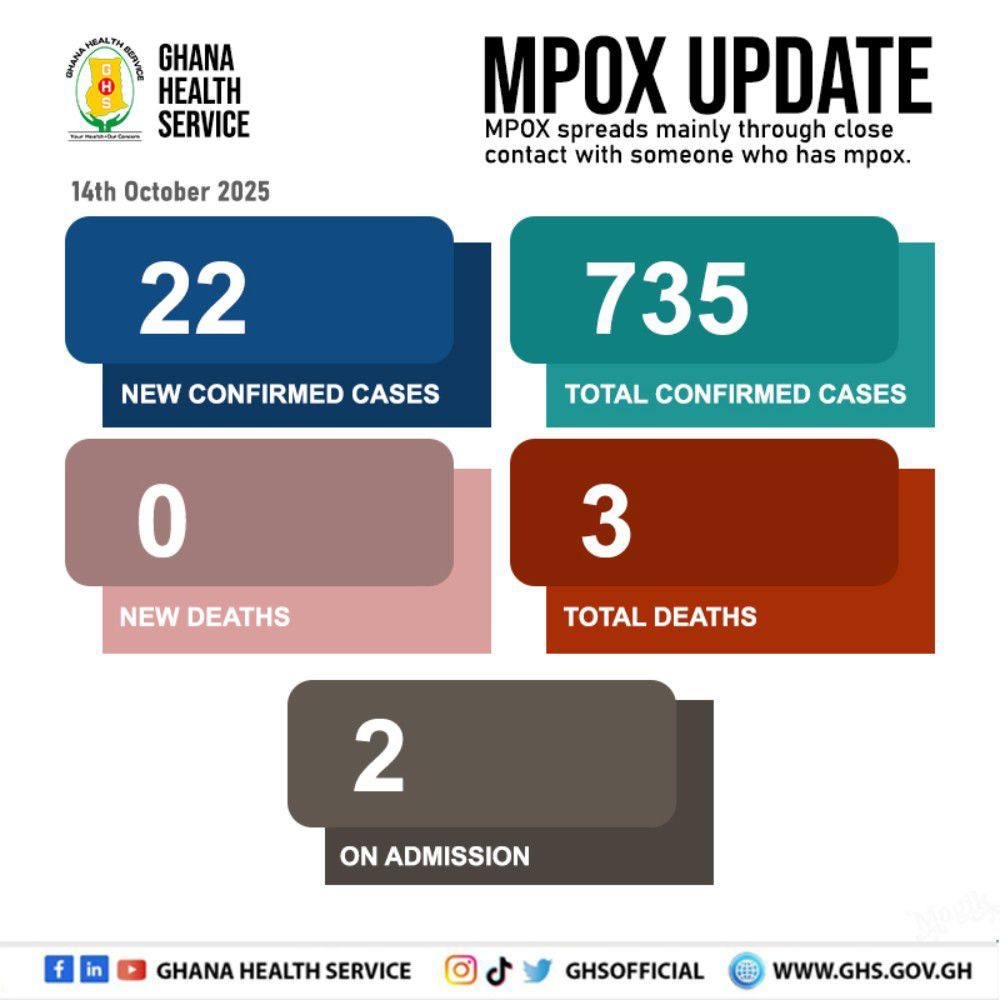 According to the Ghana Health Service, Ghana has recorded 22 new cases of Mpox, bringing the national total to 735 cases, with 3 deaths reported. Out of these, the Ashanti Region has recorded 33 cases so far.
